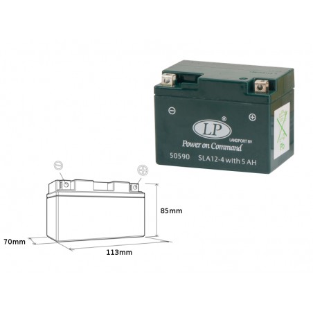 LANDPORT AKUMULATOR SLA12-4S (YTX4L-BS) 12V 5AH (113X69X85MM) BEZOBSŁUGOWY (ZALANY)SLA12-4S L Napięcie: 12 V Pojemność: 5 AH Gwarancja: 12 miesięcy Wymiary: 113mm (długość), 69mm (szerokość), 85mm (wysokość) Pasuje do: - Aeon (Benzai) 50 Cobra/CX-Sport 50 0 - 2011